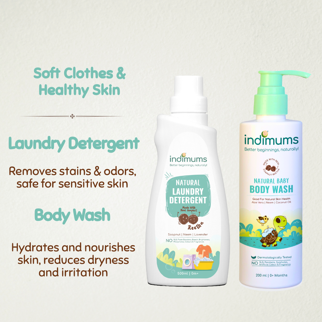 🌱 Indimums Laundry Detergent: Removes stains and odors, safe for sensitive skin.