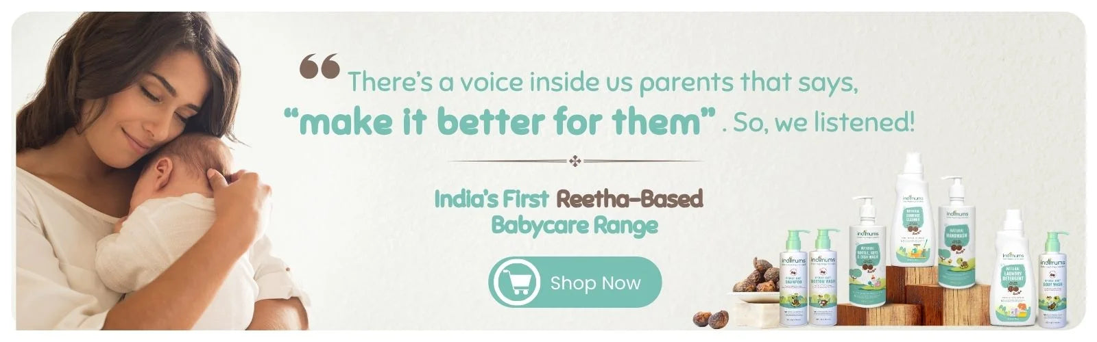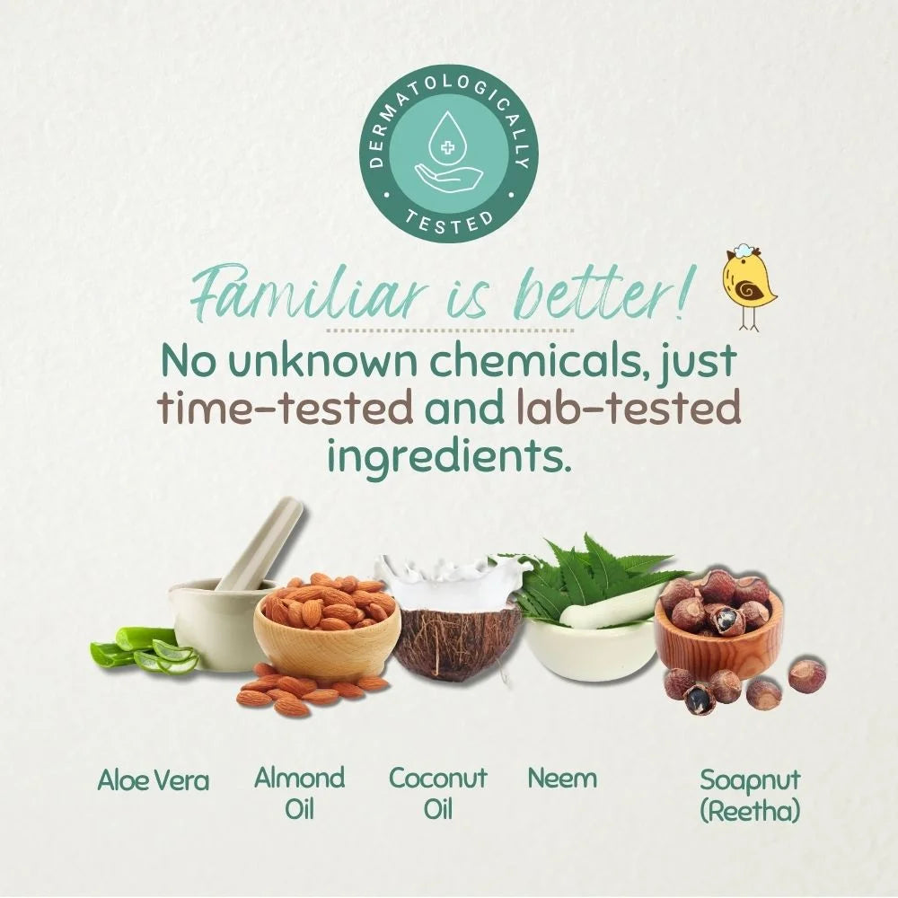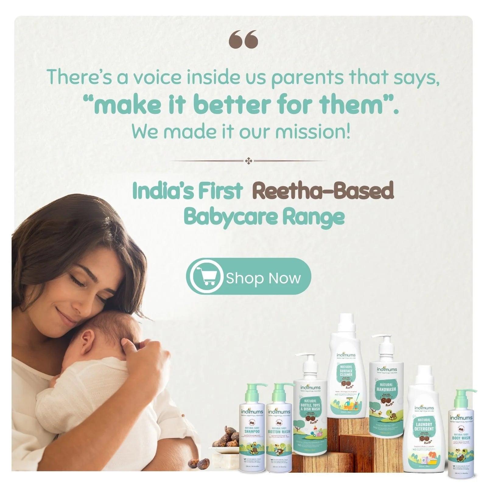 Reetha-based cleansers gently remove dirt and residue without stripping the skin’s natural moisture, and Almond Oil nourishes and protects the skin from dryness. These thoughtfully chosen ingredients ensure that your baby’s skin is cared for with the gentlest touch possible.